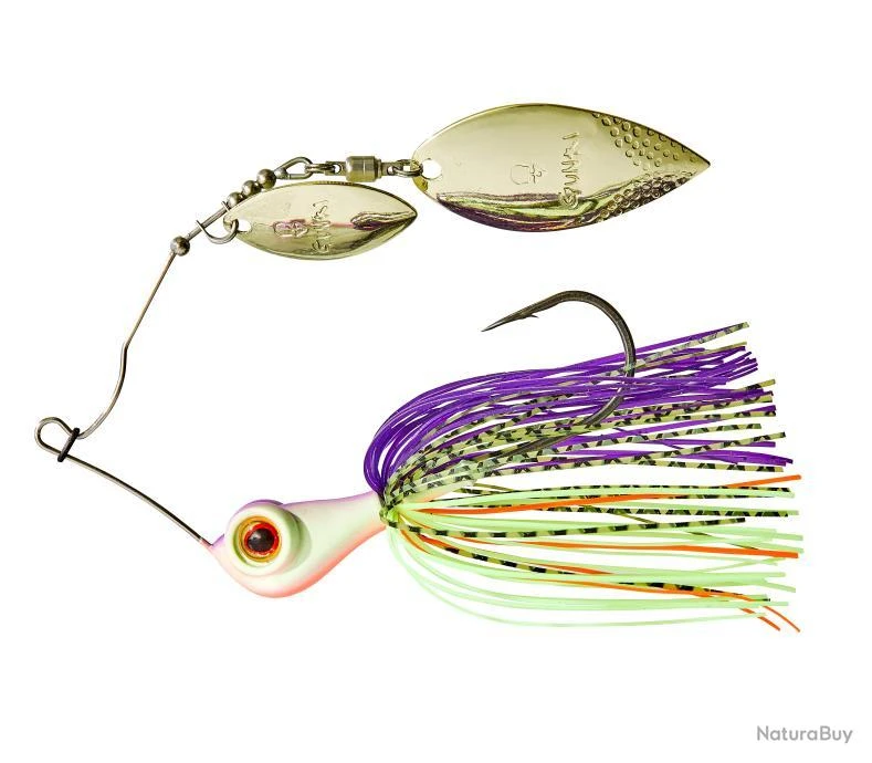 Cette nouvelle taille de GENNAKER a été pensée pour être la plus polyvalente possible et couvrir un maximum d’usage. Toujours compacte pour les 14g de lest quelle propose, cette version à double palette tire peu dans la canne. La forme de ses palettes et leur volume permettent au GENNAKER de rentrer immédiatement en rotation au contact de l’eau. On obtient ainsi un spinnerbait capable de pêcher le long des tombants et berges abruptes, mais surtout d’être ramené linéairement à vitesse plus ou moins grande aux abords des obstacles.Cette nouvelle taille de GENNAKER a été pensée pour être la plus polyvalente possible et couvrir un maximum d’usage. Toujours compacte pour les 14g de lest quelle propose, cette version à double palette tire peu dans la canne. La forme de ses palettes et leur volume permettent au GENNAKER de rentrer immédiatement en rotation au contact de l’eau. On obtient ainsi un spinnerbait capable de pêcher le long des tombants et berges abruptes, mais surtout d’être ramené linéairement à vitesse plus ou moins grande aux abords des obstacles. A mi chemin entre palette longue et allongée, ces palettes de type ‘indiana’ offrent des flahs efficaces et une vibration puissante, très incitatifs pour un carnassiers. Tout le savoir faire Gunki dans la justesse des coloris et de leur harmonisation pour déclancher une attaque est condensé dans ce leurre: depuis les couleurs des têtes et palettes et leur association avec les couleurs de jupe et le choix du signal oeil. Un spinnerbait de prospection active, véritable aimant à perches, brochets et black-bass. Jupe ligaturée par un fil métallique. Epingle inox 0.9mm. Lest en Bismuth-tin. Anneau en caoutchouc sur l’épingle pour sécuriser la fixation à la ligne. Hameçon 3/0.