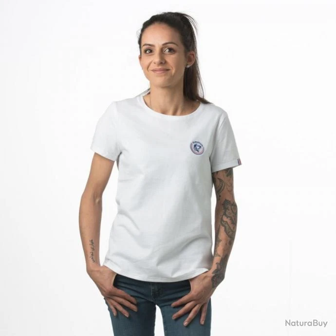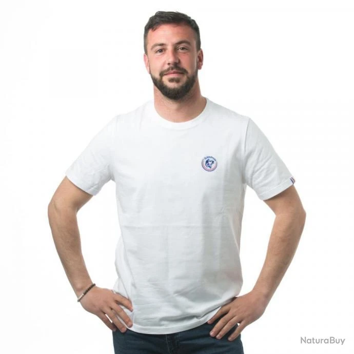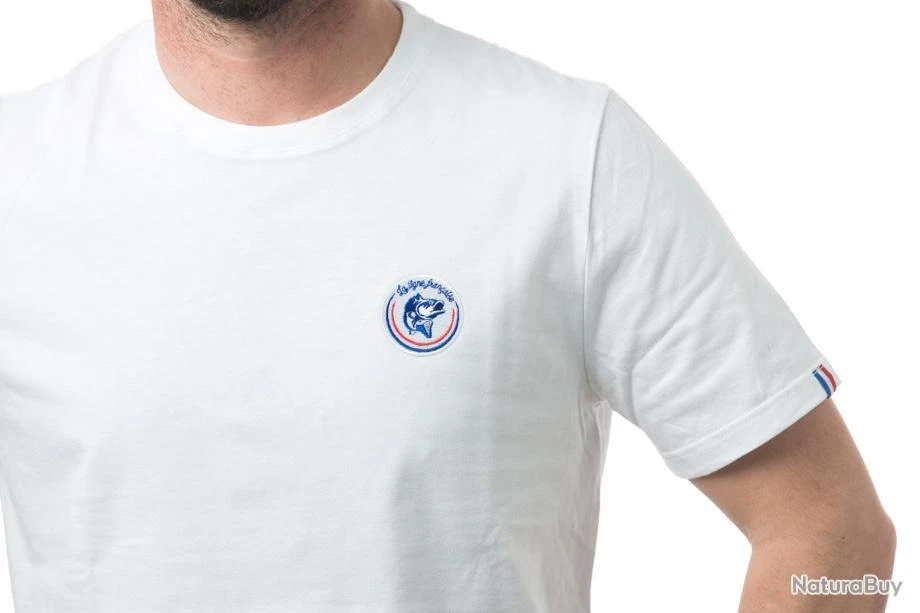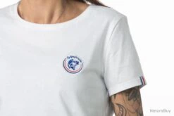 100% coton peigné biologique. Label « Origine France Garantie ». Coupé / cousu. Encolure ronde en bord-côte. Bande de propreté ton sur ton dans l’encolure (prolongement dos-épaule). Vignette clip Bleu / Blanc / Rouge sur le bas de manche gauche au porter. 170 gr.